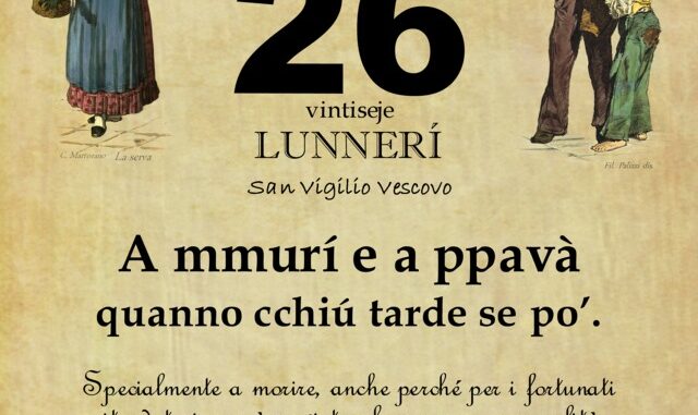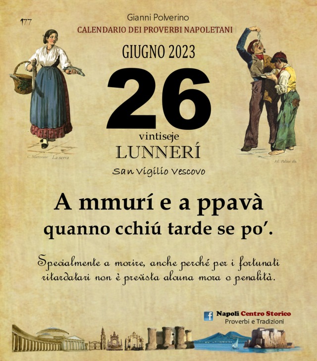 ‘O PRUVERBIO D’ ‘O JUORNO. Lunedì 26 giugno 2023 26/06/2023 binews.it ATTUALITA', EVIDENZA, Il Proverbio del Giorno 0 di Gianni Polverino A mmurí e a ppavà quanno cchiú tarde se po’. Specialmente a morire, anche perché per i fortunati ritardatari non è prevista alcuna mora o penalità.