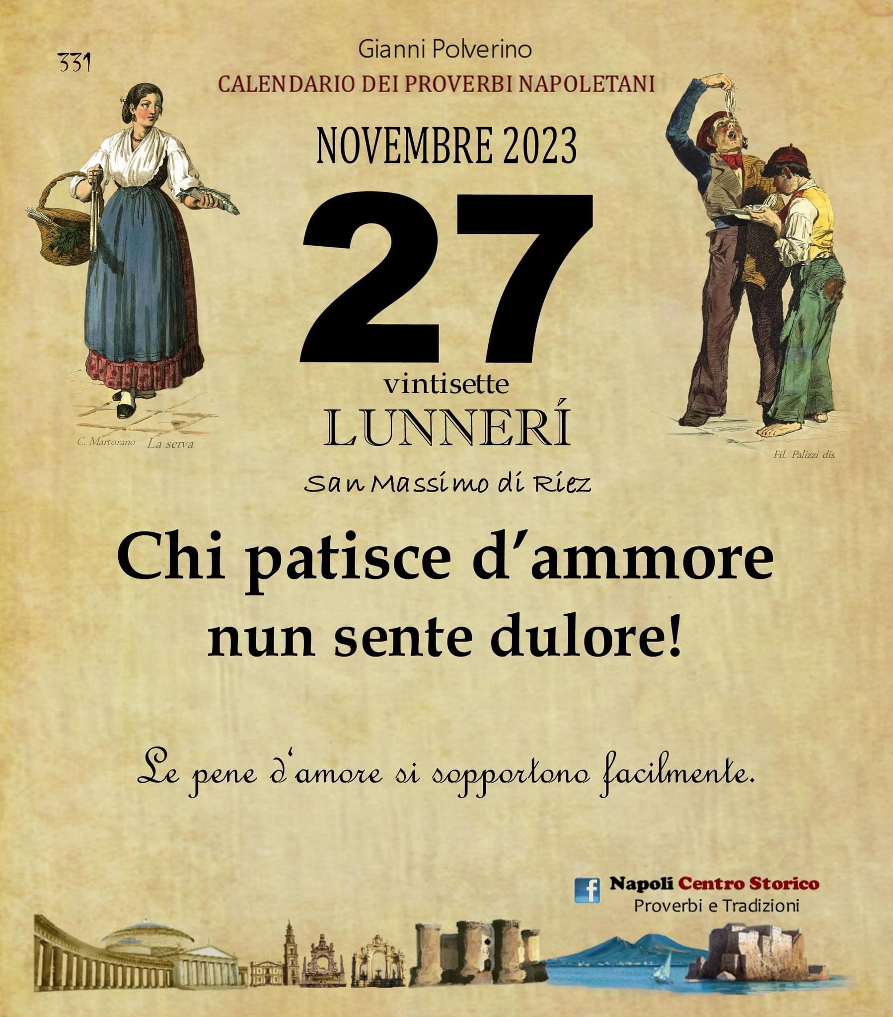 ‘O PRUVERBIO D’ ‘O JUORNO. Lunedì 27 novembre 2023 27/11/2023 binews.it ATTUALITA', EVIDENZA, Il Proverbio del Giorno 0 di Gianni Polverino Chi patisce d’ammore nun sente dulore! Le pene d‘amore si sopportano facilmente.