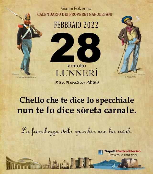 ‘O PRUVERBIO D’ ‘O JUORNO. Lunedì 28 febbraio 2021 28/02/2022 binews.it ATTUALITA', EVIDENZA, Il Proverbio del Giorno 0 di Gianni PolverinoChello che te dice lo specchiale nun te lo dice sòreta carnale. La franchezza dello specchio non ha rivali.