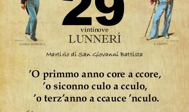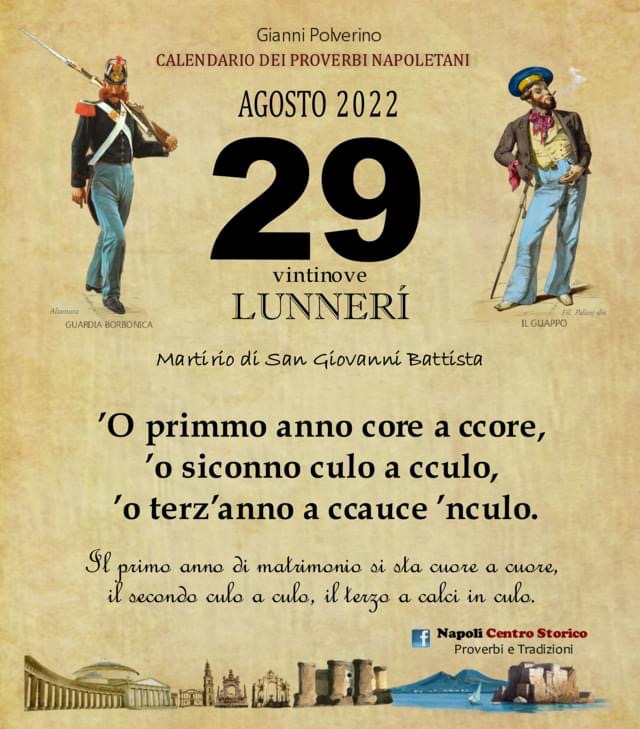 ‘O PRUVERBIO D’ ‘O JUORNO. Lunedì 29 agosto 2022 29/08/2022 binews.it ATTUALITA', EVIDENZA, Il Proverbio del Giorno 0 di Gianni Polverino ’O primmo anno core a ccore, ’o siconno culo a cculo, ’o terz’anno a ccauce ’nculo. Il primo anno di matrimonio si sta cuore a cuore, il secondo culo a culo, il terzo a calci in culo.