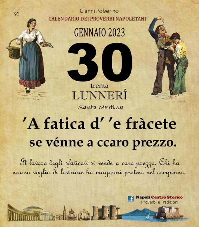 ‘O PRUVERBIO D’ ‘O JUORNO. Lunedì 30 gennaio 2023 30/01/2023 binews.it ATTUALITA', EVIDENZA, Il Proverbio del Giorno 0 di Gianni Polverino ’A fatica d’ ’e fràcete se vénne a ccaro prezzo. Il lavoro degli sfaticati si vende a caro prezzo. Chi ha scarsa voglia di lavorare ha maggiori pretese nel compenso.