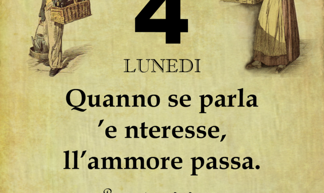 ‘O PRUVERBIO D’ ‘O JUORNO. Lunedì 4 giugno 2018 04/06/2018 binews.it ATTUALITA', Il Proverbio del Giorno 0 di Gianni Polverino Quanno se parla ’e nteresse, ll’ammore passa. Le questioni di danaro portano sempre a dissapori familiari.