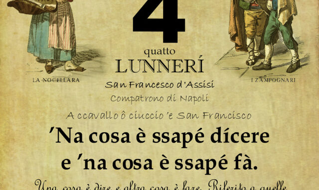 ‘O PRUVERBIO D’ ‘O JUORNO. Lunedì 4 ottobre 2021 04/10/2021 binews.it ATTUALITA', EVIDENZA, Il Proverbio del Giorno 0 di Gianni Polverino’Na cosa è ssapé dícere e ’na cosa è ssapé fà.Una cosa è dire e altra cosa è fare. Riferito a quelle persone che fanno promesse che non saranno mantenute.