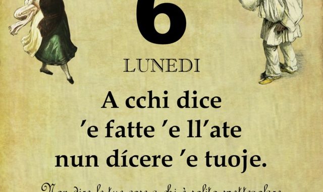 ‘O PRUVERBIO D’ ‘O JUORNO. Lunedì 6 maggio 2019 06/05/2019 binews.it ATTUALITA', EVIDENZA, Il Proverbio del Giorno 0 di Gianni Polverino A cchi dice ’e fatte ’e ll’ate nun dícere ’e tuoje. Non dire le tue cose a chi è solito spettegolare. perché finirai sulla bocca di tutti