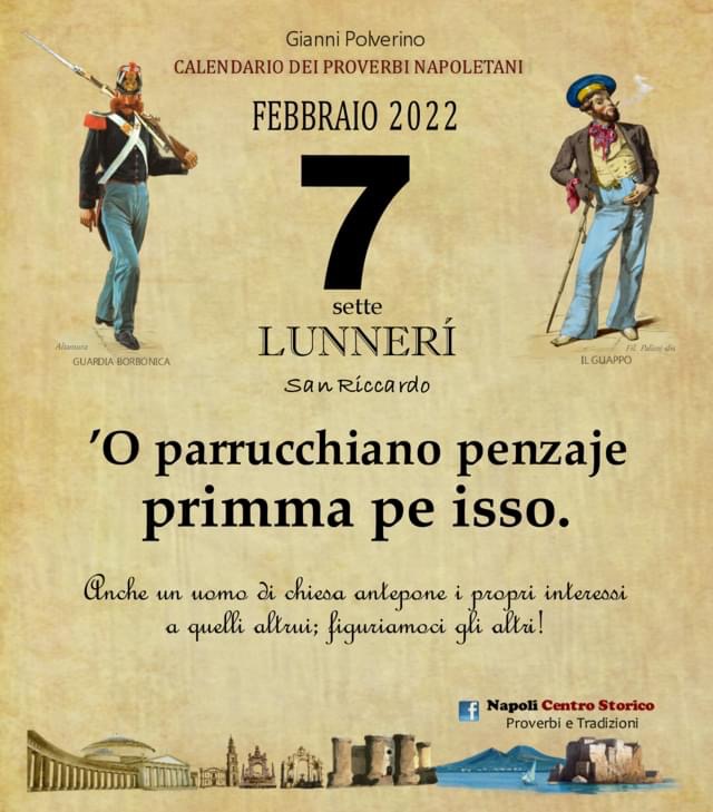 ‘O PRUVERBIO D’ ‘O JUORNO. Lunedì 7 febbraio 2022 07/02/2022 binews.it ATTUALITA', EVIDENZA, Il Proverbio del Giorno 0 di Gianni Polverino’O parrucchiano penzaje primma pe isso. Anche un uomo di chiesa antepone i propri interessi a quelli altrui; figuriamoci gli altri!