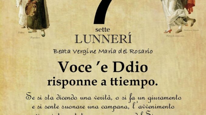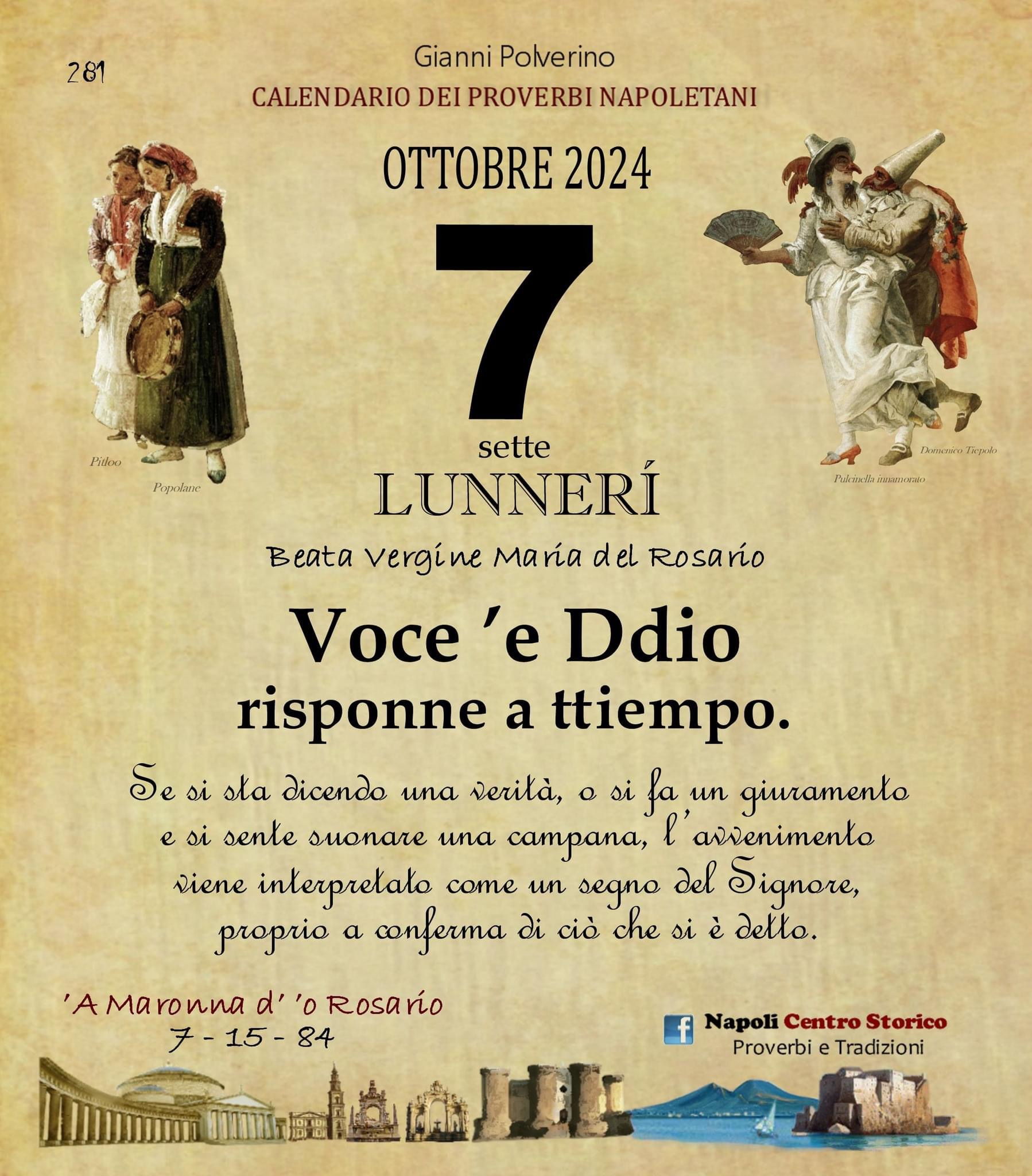 ‘O PRUVERBIO D’ ‘O JUORNO. Lunedì 7 ottobre 2024 07/10/2024 binews.it ATTUALITA', EVIDENZA, Il Proverbio del Giorno 0 di Gianni Polverino Voce ’e Ddio risponne a ttiempo. Se si sta dicendo una verità, o si fa un giuramento e si sente suonare una campana, l’avvenimento viene interpretato come un segno del Signore, proprio a conferma di ciò che si è detto.