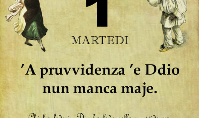‘O PRUVERBIO D’ ‘O JUORNO. Martedì 1 gennaio 2019 01/01/2019 binews.it ATTUALITA', EVIDENZA, Il Proverbio del Giorno 0 di Gianni Polverino ‘A pruvvidenza ‘e Ddio nun manca maje. Chi ha fede in Dio ha fede nella provvidenza.