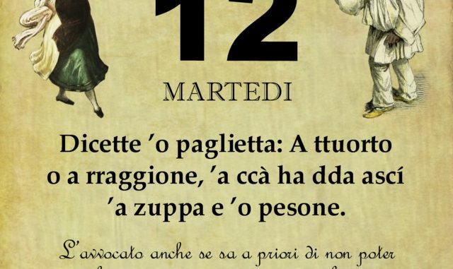 ‘O PRUVERBIO D’ ‘O JUORNO. Martedì 12 marzo 2019 12/03/2019 binews.it ATTUALITA', EVIDENZA, Il Proverbio del Giorno 0 di Gianni Polverino Dicette ’o paglietta: A ttuorto o a rraggione, ’a ccà ha dda ascí ’a zuppa e ’o pesone. L’avvocato anche se sa a priori di non poter vincere la causa ne assume comunque il patrocinio pur di guadagnarci qualcosa.