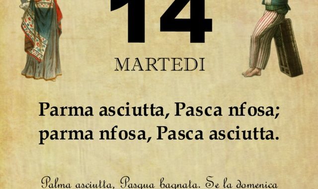 ‘O PRUVERBIO D’ ‘O JUORNO. Martedì 14 aprile 2020 14/04/2020 binews.it ATTUALITA', EVIDENZA, Il Proverbio del Giorno 0 di Gianni Polverino Parma asciutta, Pasca nfosa; parma nfosa, Pasca asciutta. Palma asciutta, Pasqua bagnata. Se la domenica delle Palme farà bel tempo, a Pasqua pioverà, o viceversa.