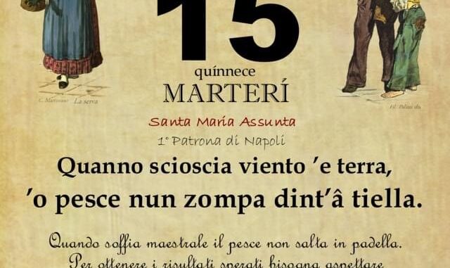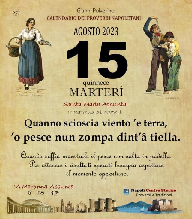 ‘O PRUVERBIO D’ ‘O JUORNO. Martedì 15 agosto 2023 15/08/2023 binews.it ATTUALITA', EVIDENZA, Il Proverbio del Giorno 0 di Gianni Polverino Quanno scioscia viento ’e terra, ’o pesce nun zompa dint’â tiella. Quando soffia maestrale il pesce non salta in padella. Per ottenere i risultati sperati bisogna aspettare il momento opportuno.