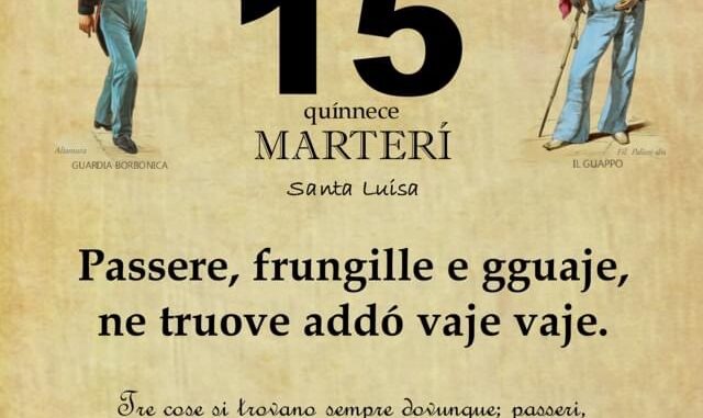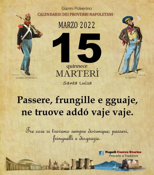 ‘O PRUVERBIO D’ ‘O JUORNO. Martedì 15 marzo 2022 15/03/2022 binews.it ATTUALITA', EVIDENZA, Il Proverbio del Giorno 0 di Gianni PolverinoPassere, frungille e gguaje, ne truove addó vaje vaje. Tre cose si trovano sempre dovunque; passeri, fringuelli e disgrazie.