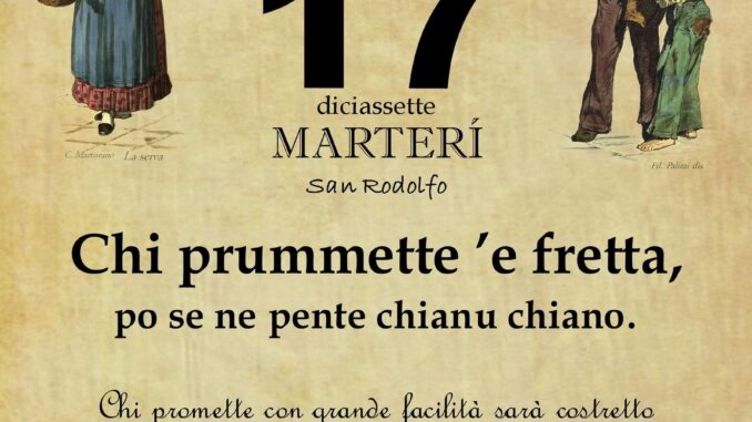 ‘O PRUVERBIO D’ ‘O JUORNO. Martedì 17 ottobre 2023 17/10/2023 binews.it ATTUALITA', EVIDENZA, Il Proverbio del Giorno 0 di Gianni Polverino Chi prummette ’e fretta, po se ne pente chianu chiano. Chi promette con grande facilità sarà costretto a rimangiarsi buona parte delle promesse fatte.