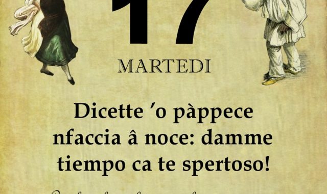 ‘O PRUVERBIO D’ ‘O JUORNO. Martedì 17 settembre 2019 17/09/2019 binews.it ATTUALITA', EVIDENZA, Il Proverbio del Giorno 0 di Gianni Polverino Dicette ’o pàppece nfaccia â noce: damme tiempo ca te spertoso! Con la calma, il tempo e la perseveranza si ottiene ciò che si desidera.