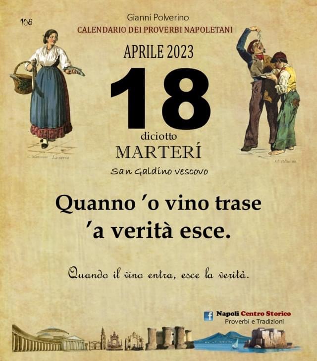 ‘O PRUVERBIO D’ ‘O JUORNO. Martedì 18 aprile 2023 18/04/2023 binews.it ATTUALITA', EVIDENZA, Il Proverbio del Giorno 0 di Gianni Polverino Quanno ’o vino trase ’a verità esce. Quando il vino entra, esce la verità.