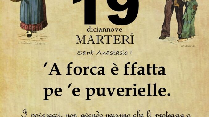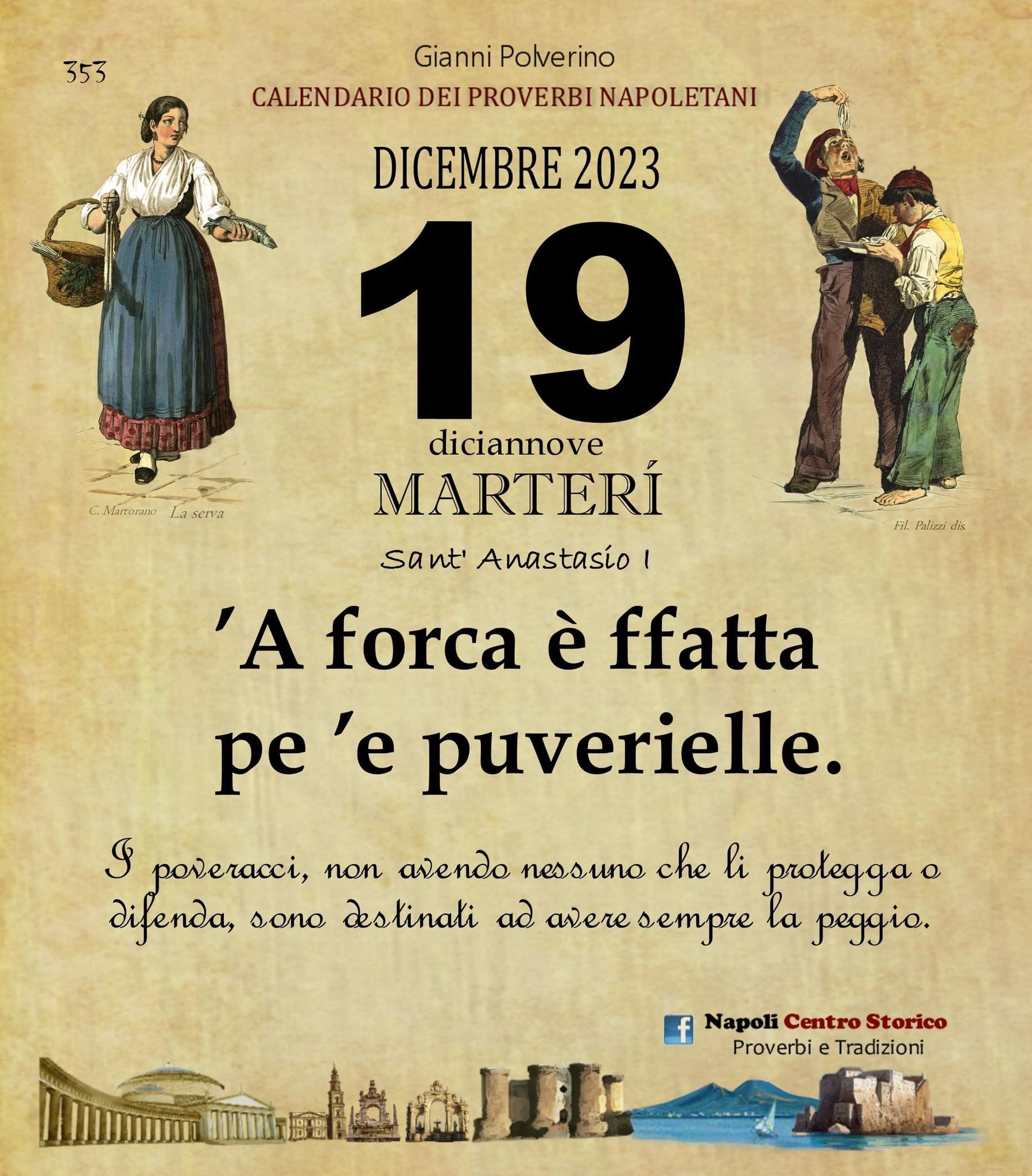 ‘O PRUVERBIO D’ ‘O JUORNO. Martedì 19 dicembre 2023 19/12/2023 binews.it ATTUALITA', EVIDENZA, Il Proverbio del Giorno 0 di Gianni Polverino ’A forca è ffatta pe ’e puverielle. I poveracci, non avendo nessuno che li protegga o difenda, sono destinati ad avere sempre la peggio.