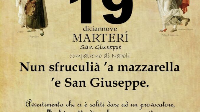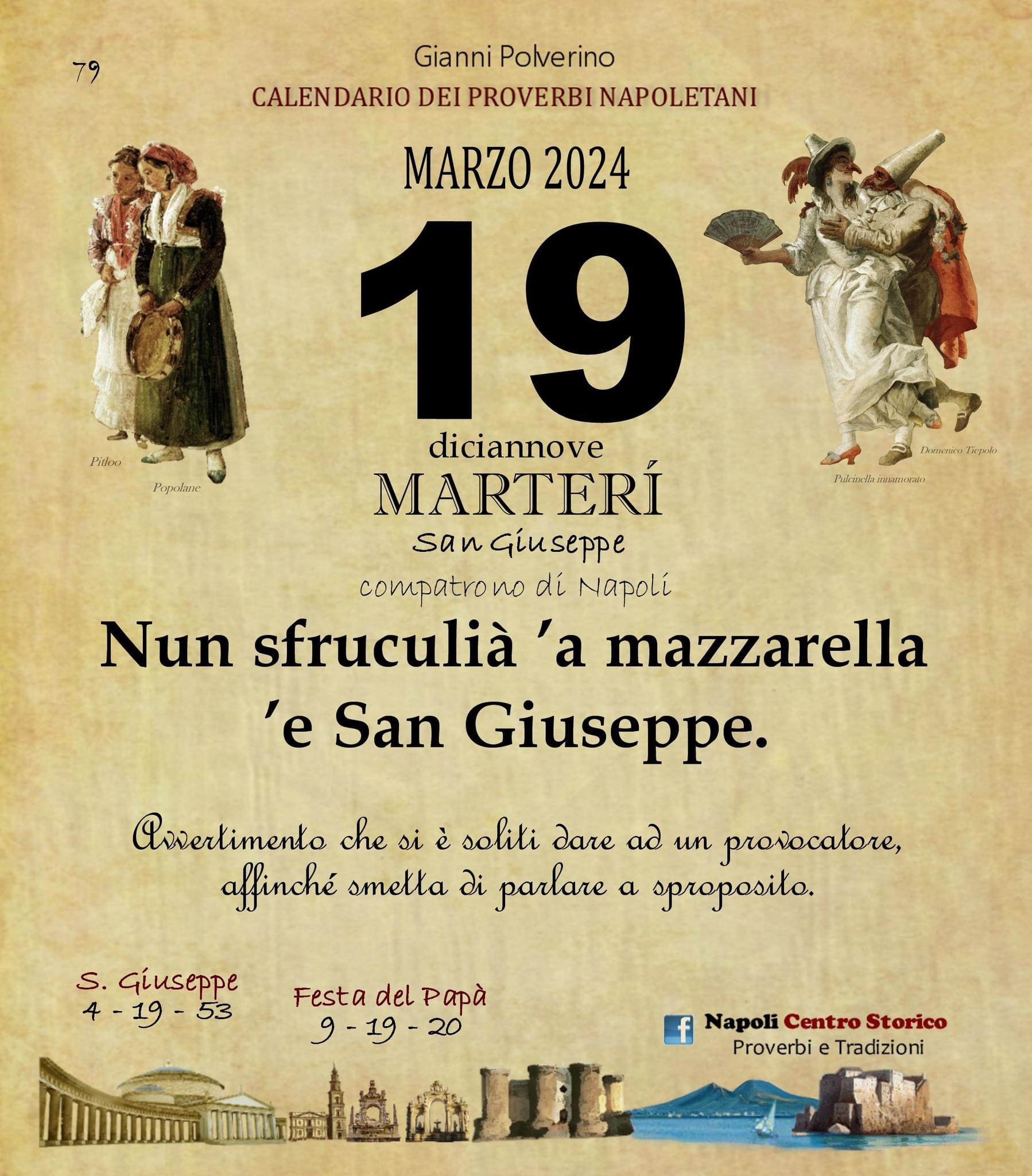 ‘O PRUVERBIO D’ ‘O JUORNO. Martedì 19 marzo 2024 19/03/2024 binews.it ATTUALITA', EVIDENZA, Il Proverbio del Giorno 0 di Gianni Polverino Nun sfruculià ’a mazzarella ’e San Giuseppe. Avvertimento che si è soliti dare ad un provocatore, affinché smetta di parlare a sproposito.