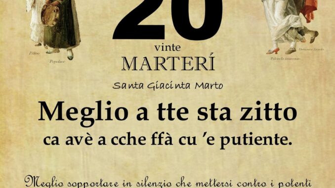 ‘O PRUVERBIO D’ ‘O JUORNO. Martedì 20 febbraio 2024 20/02/2024 binews.it ATTUALITA', EVIDENZA, Il Proverbio del Giorno 0 di Gianni Polverino Meglio a tte sta zitto ca avè a cche ffà cu ’e putiente. Meglio sopportare in silenzio che mettersi contro i potenti visto che alla fine sono sempre questi ad averla vinta.