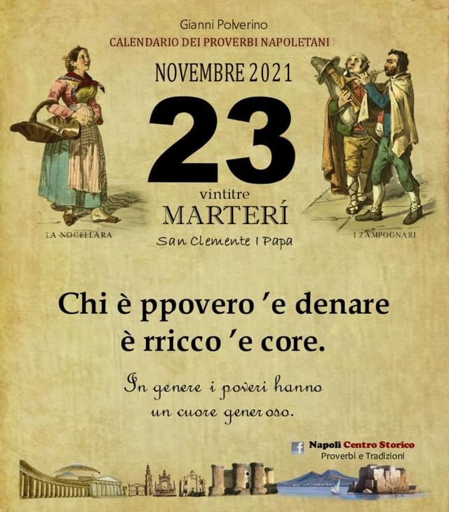 ‘O PRUVERBIO D’ ‘O JUORNO. Martedì 23 novembre 2021 23/11/2021 binews.it ATTUALITA', EVIDENZA, Il Proverbio del Giorno 0 di Gianni PolverinoChi è ppovero ’e denare è rricco ’e core. In genere i poveri hanno un cuore generoso.