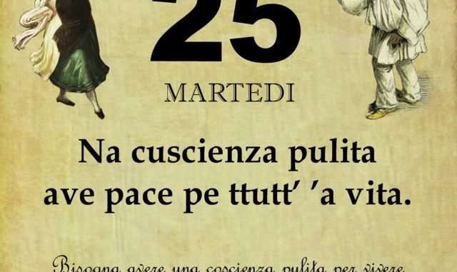 ‘O PRUVERBIO D’ ‘O JUORNO. Martedì 25 giugno 2019 25/06/2019 binews.it ATTUALITA', EVIDENZA, Il Proverbio del Giorno 0 di Gianni Polverino Na cuscienza pulita ave pace pe ttutt’ ’a vita. Bisogna avere una coscienza pulita per vivere in pace con se stessi, senza rimorsi, né rimpianti.