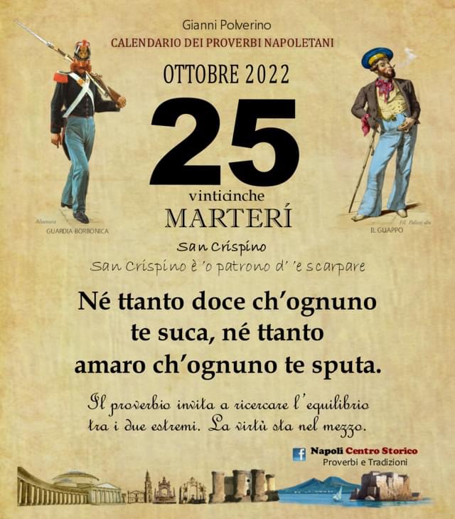 ‘O PRUVERBIO D’ ‘O JUORNO. Martedì 25 ottobre 2022 25/10/2022 binews.it ATTUALITA', EVIDENZA, Il Proverbio del Giorno 0 di Gianni PolverinoNé ttanto doce ch’ognuno te suca, né ttanto amaro ch’ognuno te sputa. Il proverbio invita a ricercare l’equilibrio tra i due estremi. La virtù sta nel mezzo.