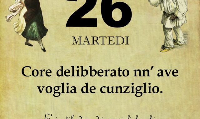 ‘O PRUVERBIO D’ ‘O JUORNO. Martedì 26 marzo 2019 26/03/2019 binews.it ATTUALITA', EVIDENZA, Il Proverbio del Giorno 0 di Gianni Polverino Core delibberato nn’ ave voglia de cunziglio. E‘ inutile dare dei consigli ha chi in cuor suo ha già deciso cosa fare.