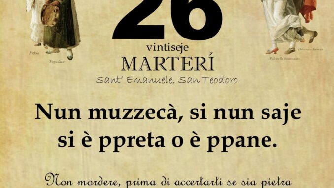 ‘O PRUVERBIO D’ ‘O JUORNO. Martedì 26 marzo 2024 26/03/2024 binews.it ATTUALITA', EVIDENZA, Il Proverbio del Giorno 0 di Gianni Spolverino Nun muzzecà, si nun saje si è ppreta o è ppane. Non mordere, prima di accertarti se sia pietra o pane. In ogni cosa, prima di agire, valuta bene la situazione.