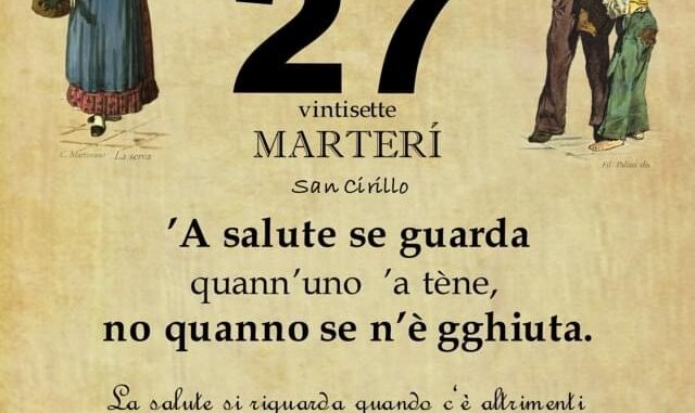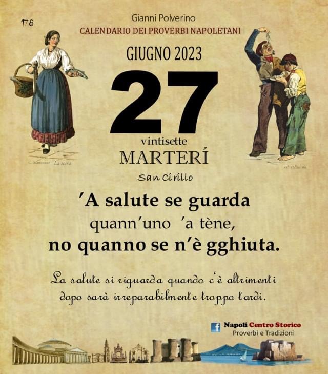 ‘O PRUVERBIO D’ ‘O JUORNO. Martedì 27 giugno 2023 27/06/2023 binews.it ATTUALITA', EVIDENZA, Il Proverbio del Giorno 0 di Gianni Polverino ’A salute se guarda quann’uno ’a tène, no quanno se n’è gghiuta. La salute si riguarda quando c‘è, altrimenti dopo sarà irreparabilmente troppo tardi.
