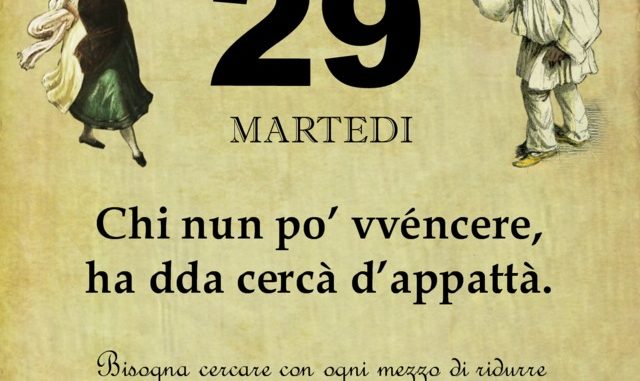 ‘O PRUVERBIO D’ ‘O JUORNO. Martedì 29 gennaio 2019 29/01/2019 binews.it ATTUALITA', EVIDENZA, Il Proverbio del Giorno 0 di Gianni Polverino Chi nun po’ vvéncere, ha dda cercà d’appattà. Bisogna cercare con ogni mezzo di ridurre al massimo un qualsiasi danno.