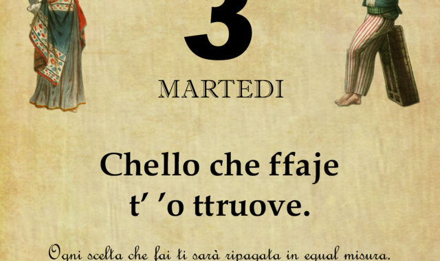 ‘O PRUVERBIO D’ ‘O JUORNO. Martedì 3 novembre 2020 03/11/2020 binews.it ATTUALITA', EVIDENZA, Il Proverbio del Giorno 0 di Gianni Polverino Chello che ffaje t’ ’o ttruove. Ogni scelta che fai ti sarà ripagata in egual misura.