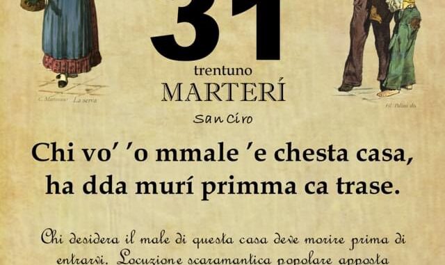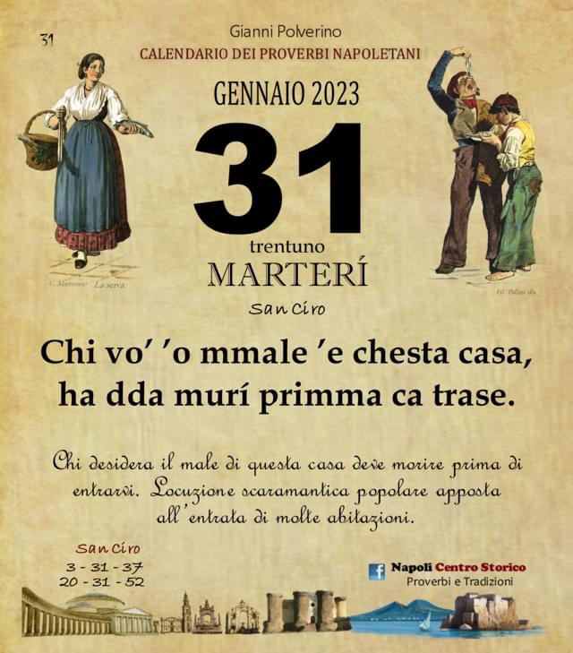 ‘O PRUVERBIO D’ ‘O JUORNO. Martedì 31 gennaio 2023 31/01/2023 binews.it ATTUALITA', EVIDENZA, Il Proverbio del Giorno 0 di Gianni Polverino Chi vo’ ’o mmale ’e chesta casa, ha dda murí primma ca trase. Chi desidera il male di questa casa deve morire prima di entrarvi. Locuzione scaramantica popolare apposta all’entrata di molte abitazioni.