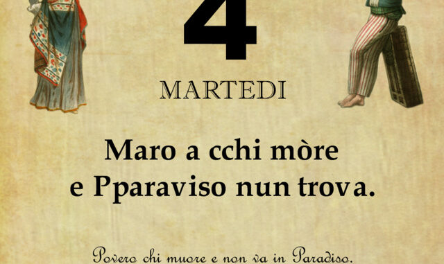 ‘O PRUVERBIO D’ ‘O JUORNO. Martedì 4 agosto 2020 04/08/2020 binews.it ATTUALITA', EVIDENZA, Il Proverbio del Giorno 0 di Gianni Polverino Maro a cchi mòre e Pparaviso nun trova. Povero chi muore e non va in Paradiso.