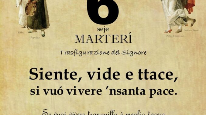 ‘O PRUVERBIO D’ ‘O JUORNO. Martedì 6 agosto 2024 06/08/2024 binews.it ATTUALITA', EVIDENZA, Il Proverbio del Giorno 0 di Gianni Polverino Siente, vide e ttace,si vuó vivere ’nsanta pace. Se vuoi vivere tranquillo è meglio tacere su tutto ciò che si sente e si vede.