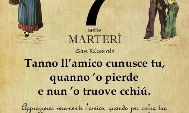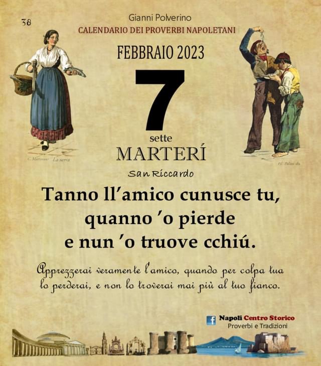 ‘O PRUVERBIO D’ ‘O JUORNO. Martedì 7 febbraio 2023 07/02/2023 binews.it ATTUALITA', EVIDENZA, Il Proverbio del Giorno 0 di Gianni Polverino Tanno ll’amico cunusce tu, quanno ’o pierde e nun ’o truove cchiú. Apprezzerai veramente l’amico, quando per colpa tua lo perderai, e non lo troverai mai più al tuo fianco.
