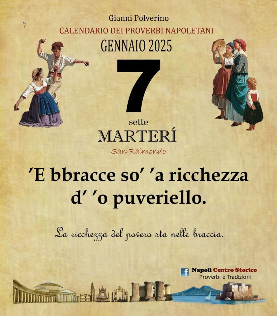 ‘O PRUVERBIO D’ ‘O JUORNO. Martedì 7 gennaio 2025 07/01/2025 binews.it ATTUALITA', EVIDENZA, Il Proverbio del Giorno 0 di Gianni Polverino ’E bbracce so’ ’a ricchezza d’ ’o puveriello. La ricchezza del povero sta nelle braccia.