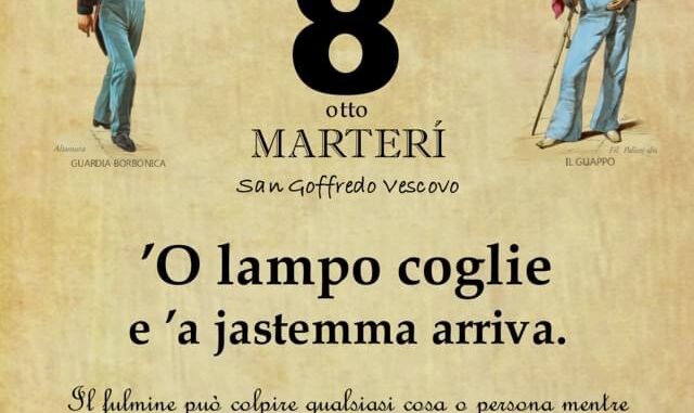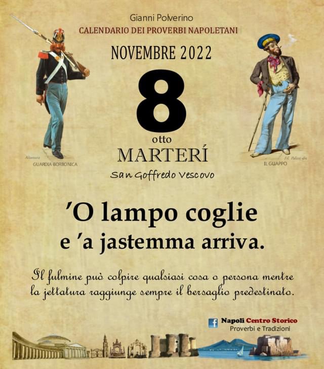 ‘O PRUVERBIO D’ ‘O JUORNO. Martedì 8 novembre 2022 08/11/2022 binews.it ATTUALITA', EVIDENZA, Il Proverbio del Giorno 0 di Gianni Polverino’O lampo coglie e ’a jastemma arriva. Il fulmine può colpire qualsiasi cosa o persona mentre la jettatura raggiunge sempre il bersaglio predestinato.