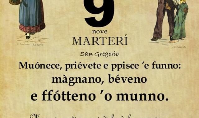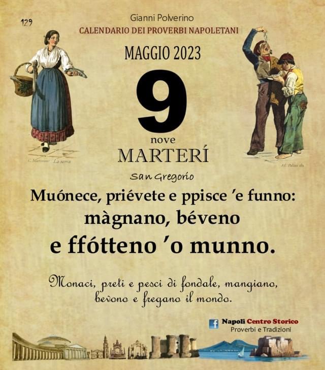 ‘O PRUVERBIO D’ ‘O JUORNO. Martedì 9 maggio 2023 09/05/2023 binews.it ATTUALITA', EVIDENZA, Il Proverbio del Giorno 0 di Gianni Polverino Muónece, priévete e ppisce ’e funno: màgnano, béveno e ffótteno ’o munno. Monaci, preti e pesci di fondale, mangiano, bevono e fregano il mondo.