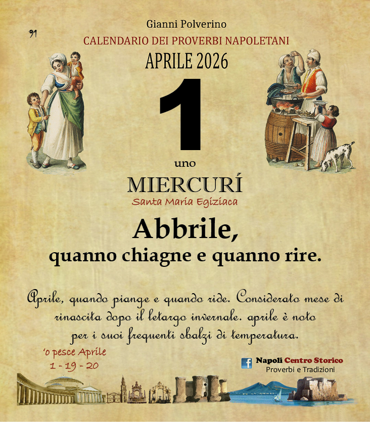 ‘O PRUVERBIO D’ ‘O JUORNO. Mercoledì 1 Aprile 2026 01/04/2026 binews.it ATTUALITA', EVIDENZA, Il Proverbio del Giorno 0 di Gianni PolverinoAbbrile, quanno chiagne e quanno rire.Aprile, quando piange e quando ride. Considerato mese di rinascita dopo il letargo invernale. aprile è noto per i suoi frequenti sbalzi di temperatura.