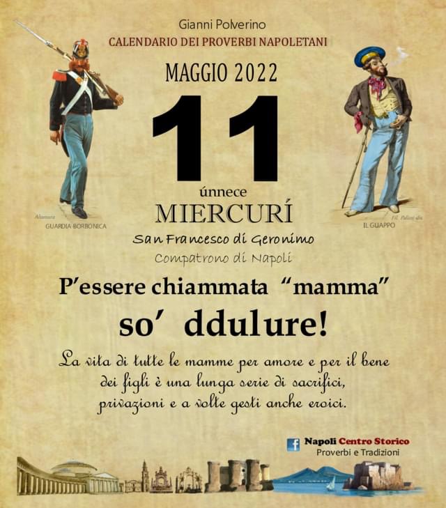 ‘O PRUVERBIO D’ ‘O JUORNO. Mercoledì 11 maggio 2022 11/05/2022 binews.it ATTUALITA', EVIDENZA, Il Proverbio del Giorno 0 di Gianni d Polverino P’essere chiammata “mamma” so’ ddulure! La vita di tutte le mamme per amore e per il bene dei figli è una lunga serie di sacrifici, privazioni e a volte gesti anche eroici.