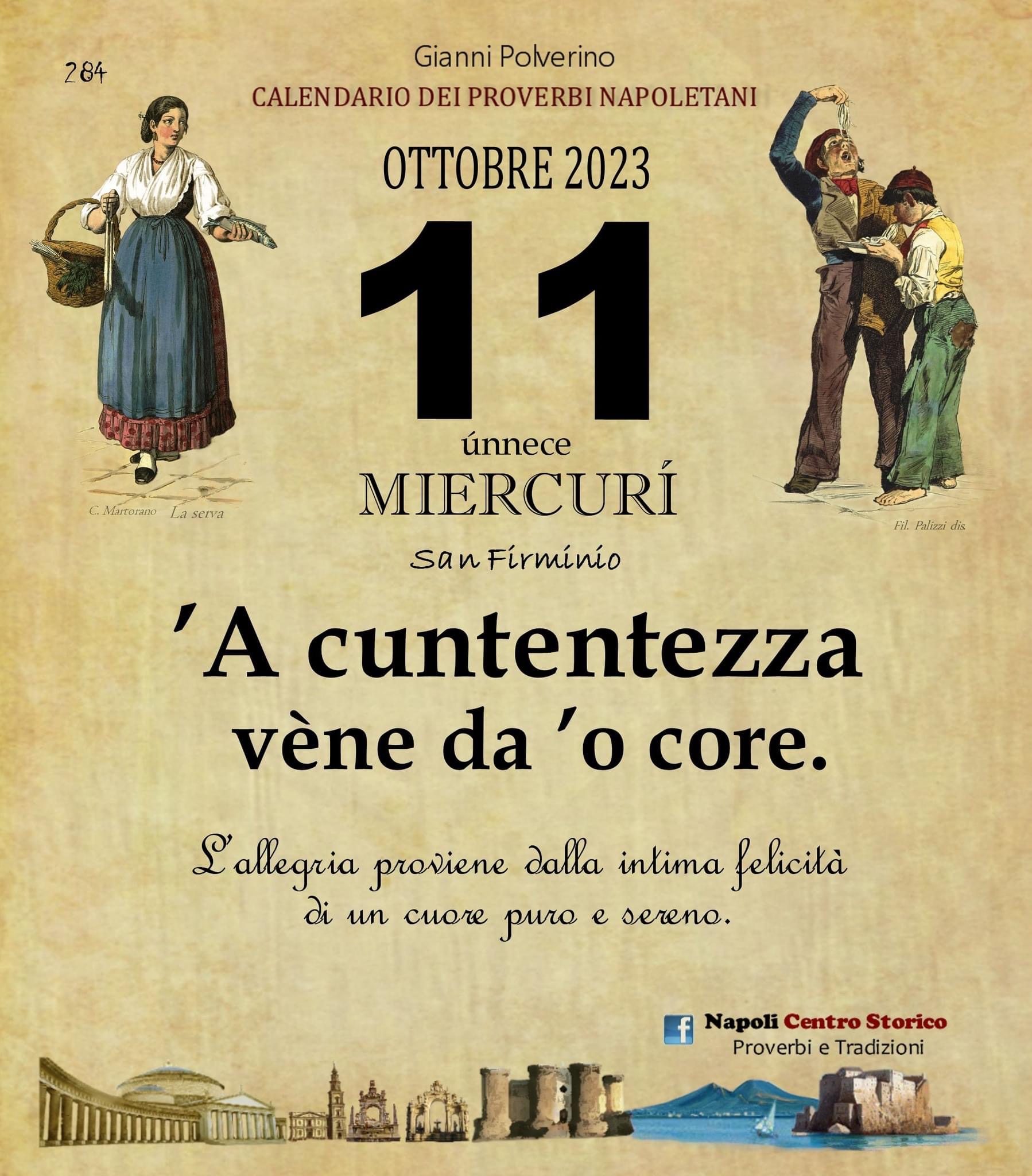 ‘O PRUVERBIO D’ ‘O JUORNO. Mercoledì 11 ottobre 2023 11/10/2023 binews.it ATTUALITA', EVIDENZA, Il Proverbio del Giorno 0 di Gianni Polverino ’A cuntentezza vène da ’o core. L’allegria proviene dalla intima felicità di un cuore puro e sereno.