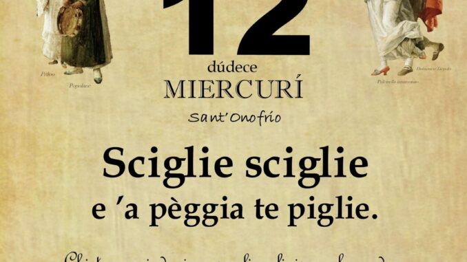 ‘O PRUVERBIO D’ ‘O JUORNO. Mercoledì 12 giugno 2024 12/06/2024 binews.it ATTUALITA', EVIDENZA, SANT'Oggi 0 di Gianni Polverino Sciglie sciglie e ’a pèggia te piglie. Chi troppo indugia a scegliere finisce col prendere lo scarto degli altri