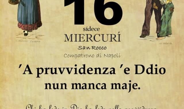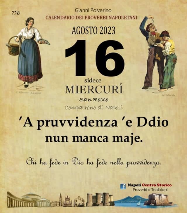 ‘O PRUVERBIO D’ ‘O JUORNO. Mercoledì 16 agosto 2023 16/08/2023 binews.it ATTUALITA', EVIDENZA, Il Proverbio del Giorno 0 di Gianni Polverino ’A pruvvidenza ’e Ddio nun manca maje. Chi ha fede in Dio ha fede nella provvidenza. Perchè spesso, nei momenti di maggior bisogno, l’amico ti viene meno.