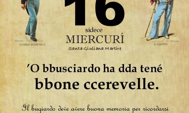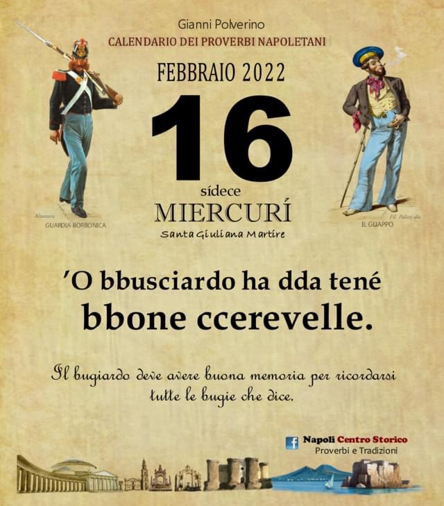 ‘O PRUVERBIO D’ ‘O JUORNO. Mercoledì 16 febbraio 2022 16/02/2022 binews.it ATTUALITA', EVIDENZA, Il Proverbio del Giorno 0 di Gianni Polverino’O bbusciardo ha dda tené bbone ccerevelle. Il bugiardo deve avere buona memoria per ricordarsi tutte le bugie che dice.