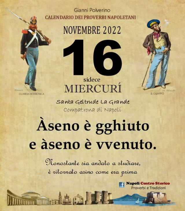 ‘O PRUVERBIO D’ ‘O JUORNO. Mercoledì 16 novembre 2022 16/11/2022 binews.it ATTUALITA', EVIDENZA, Il Proverbio del Giorno 0 di Gianni PolverinoÀseno è gghiuto e àseno è vvenuto. Nonostante sia andato a studiare, è ritornato asino come era prima