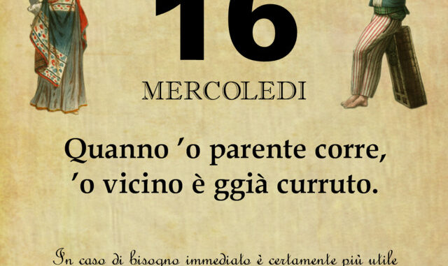‘O PRUVERBIO D’ ‘O JUORNO. Mercoledì 16 settembre 2020 16/09/2020 binews.it ATTUALITA', EVIDENZA, Il Proverbio del Giorno 0 di Gianni Polverino Quanno ’o parente corre, ’o vicino è ggià curruto. In caso di bisogno immediato è certamente più utile il vicino di casa.