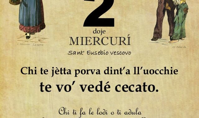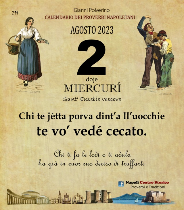 ‘O PRUVERBIO D’ ‘O JUORNO. Mercoledì 2 agosto 2023 02/08/2023 binews.it ATTUALITA', EVIDENZA, Il Proverbio del Giorno 0 di Gianni Polverino Chi te jètta porva dint’a ll’uocchie te vo’ vedé cecato. Chi ti fa le lodi o ti adula ha già in cuor suo deciso di truffarti.