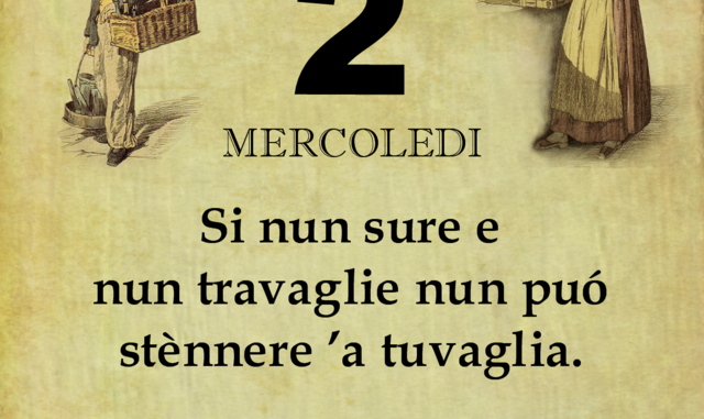 ‘O PRUVERBIO D’ ‘O JUORNO. Mercoledì 2 maggio 2018 02/05/2018 binews.it ATTUALITA', Il Proverbio del Giorno 0 di Gianni Polverino Si nun sure e nun travaglie nun puó stènnere ’a tuvaglia. Se non sudi e non lavori, non mangi.