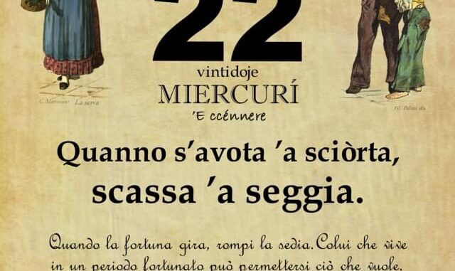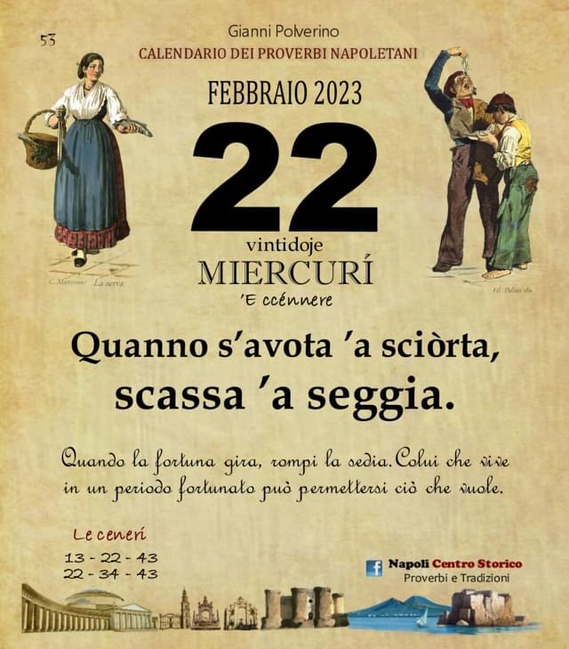 ‘O PRUVERBIO D’ ‘O JUORNO. Mercoledì 22 febbraio 2023 22/02/2023 binews.it ATTUALITA', EVIDENZA, Il Proverbio del Giorno 0 di Gianni Polverino Quanno s’avota ’a sciòrta, scassa ’a seggia. Quando la fortuna gira, rompi la sedia. Colui che vive in un periodo fortunato può permettersi ciò che vuole.