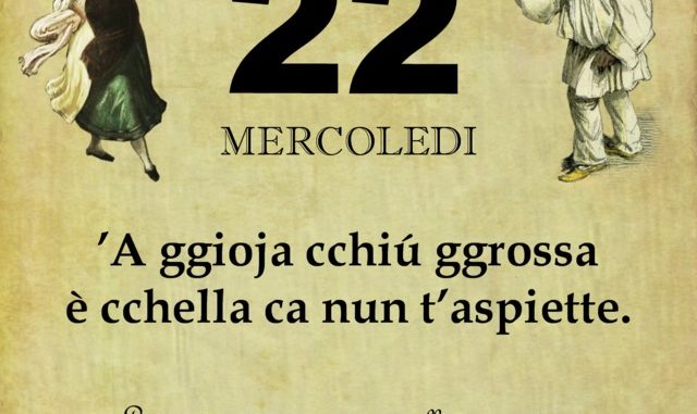 ‘O PRUVERBIO D’ ‘O JUORNO. Mercoledì 22 maggio 2019 22/05/2019 binews.it ATTUALITA', EVIDENZA, Il Proverbio del Giorno 0 di Gianni Polverino ’A ggioja cchiú ggrossa è cchella ca nun t’aspiette. La gioia più grande è quella non attesa.
