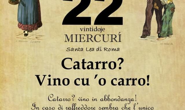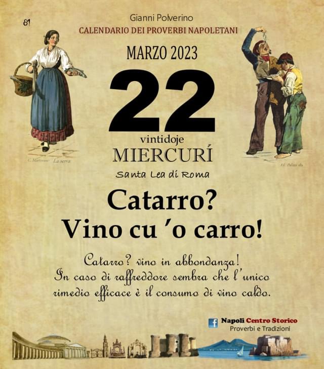‘O PRUVERBIO D’ ‘O JUORNO. Mercoledì 22 marzo 2023 22/03/2023 binews.it ATTUALITA', EVIDENZA, Il Proverbio del Giorno 0 di Gianni Polverino Catarro? Vino cu ’o carro! Catarro? vino in abbondanza! In caso di raffreddore sembra che l’unico rimedio efficace è il consumo di vino caldo.