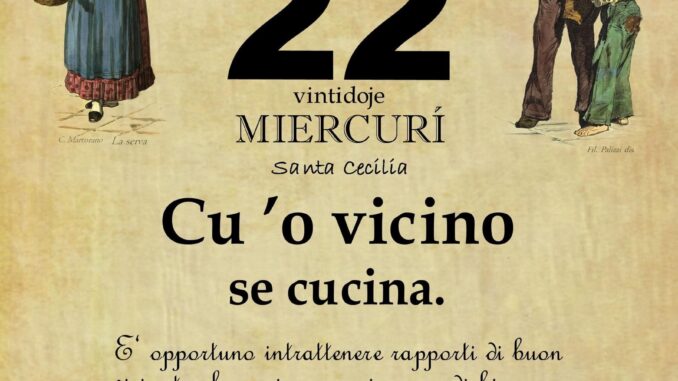 ‘O PRUVERBIO D’ ‘O JUORNO. Mercoledì 22 novembre 2023. 22/11/2023 binews.it ATTUALITA', EVIDENZA, Il Proverbio del Giorno 0 di Gianni Polverino Cu ’o vicino se cucina. E‘ opportuno intrattenere rapporti di buon vicinato che assicurano, in caso di bisogno, un reciproco aiuto.